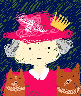 Anne’s design combines the Queen’s interests, such as pigeon racing, hats, and horses, alongside a depiction of a young Queen Elizabeth II in a white dress, one of her most iconic outfits.