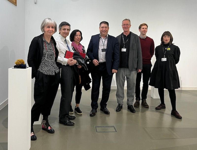 Pictured at the Tansa exhibition closing event, from left, Professor Lesley Millar MBE, Jason James, Director General of the Daiwa Anglo Japanese Foundation, Susan Meehan, Grants and Scholarship Officer of the Daiwa Anglo Japanese Foundation, Professor Bashir Makhoul, UCA Vice Chancellor and President, Professor Simon Olding, Director of the Crafts Study Centre, Rory Steele. Programmes Executive of the Great Britain Sasakawa Foundation and Professor Victoria Kelley, Director of Research at UCA.