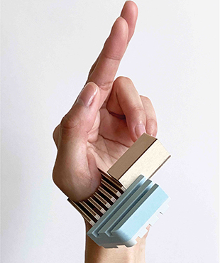 Another artist like Maddy, exploring wearable jewellery, is BA (Hons) Jewellery graduate Michelle Chung. Influenced by the built environment, Michelle sees jewellery as an extension of the human body and as a piece of architecture. She works mainly in jesmonite and plywood to imitate the qualities of the built environment and produces futuristic, urban and unconventional wearable jewellery.